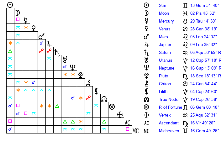 | Moon | 2 Pisces 31 | 1 Libra 44 | 2 Gemini 32 |