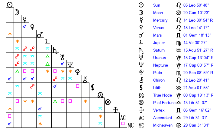 | Venus | 18 Leo 14 | 27 Gemini 10 | 28 Virgo 49 |