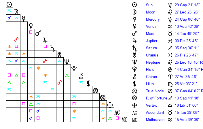| Sun | 29 Capricorn 22 | 0 Aquarius 36 | 7 Taurus 7 |