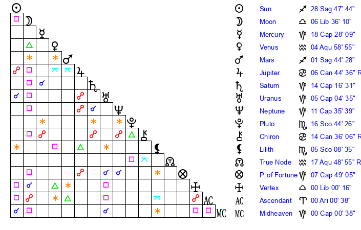 | Moon | 6 Libra 35 | 6 Capricorn 10 | 22 Capricorn 8 |