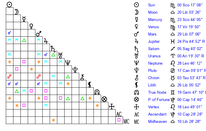| Sun | 0 Scorpio 17 | 1 Scorpio 32 | 9 Aquarius 35 |