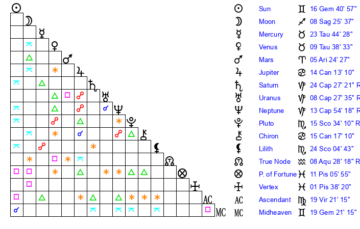 | Sun | 16 Gemini 41 | 17 Gemini 12 | 20 Cancer 5 |