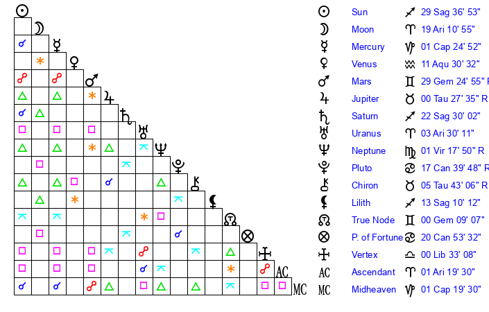 | Sun | 29 Sagittarius 37 | 0 Capricorn 5 | 7 Aries 32 |