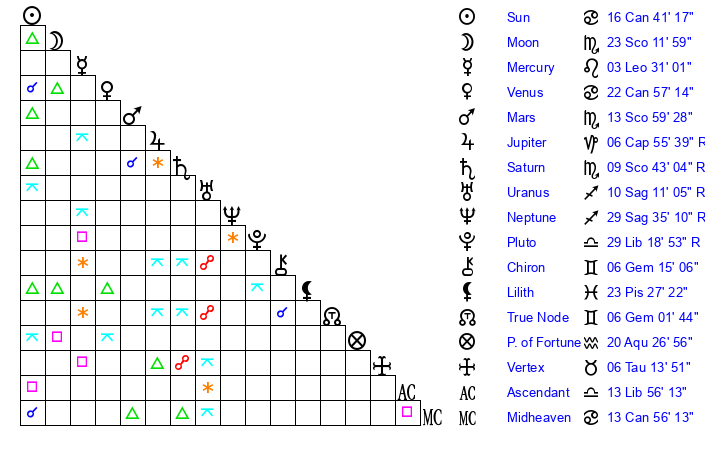 | Moon | 23 Scorpio 10 | 21 Sagittarius 46 | 13 Taurus 18 |
