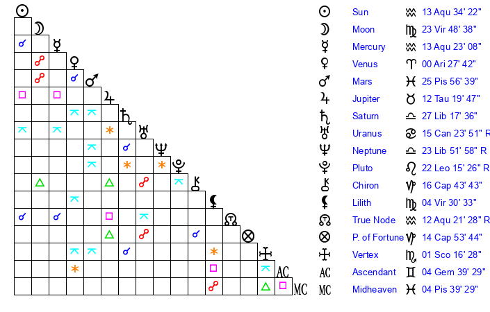 | Mercury | 13 Aquarius 23 | 9 Aquarius 15 | 27 Pisces 55 |