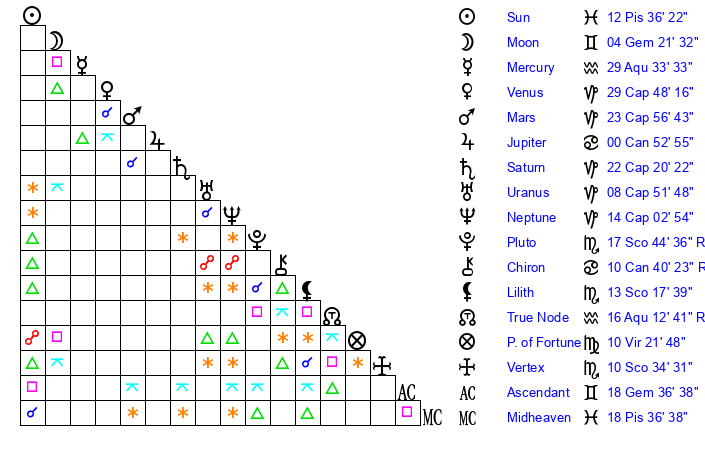 Sun | 12 Pisces 36 | 13 Pisces 7 | 17 Aries 22 |