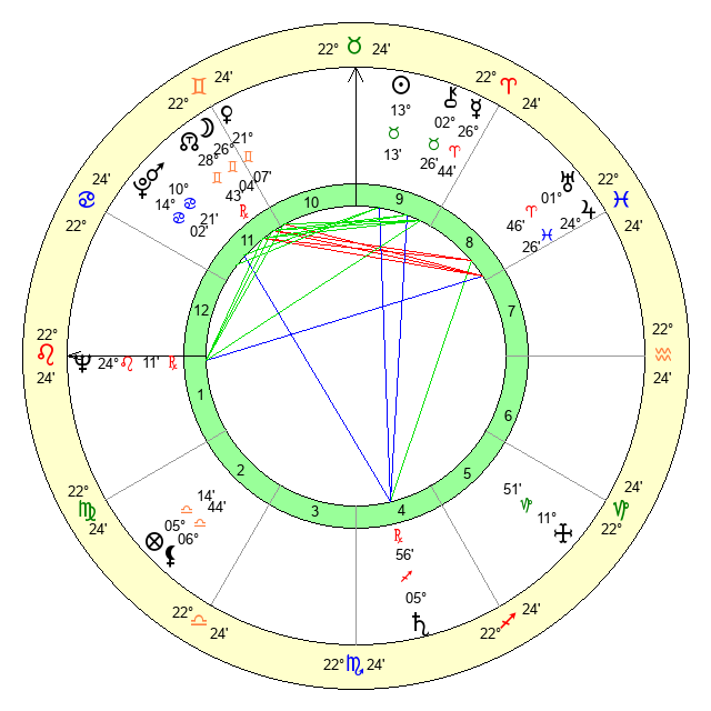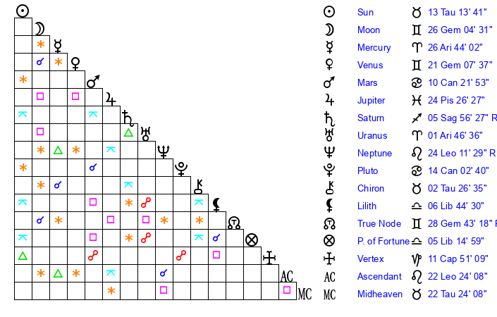 | Neptune | 24 Leo 11 | 1 Aries 12 | 26 Leo 21 |
