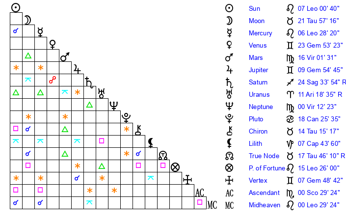 | Venus | 23 Gemini 54 | 29 Gemini 28 | 17 Libra 58 |