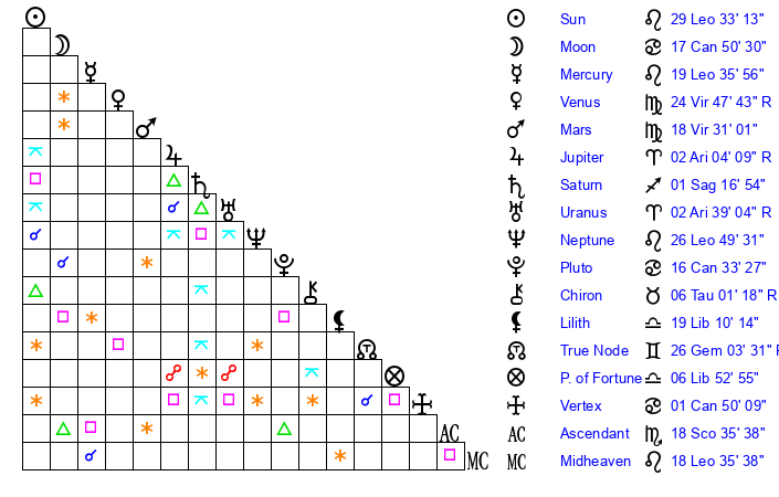 | Sun | 29 Leo 33 | 0 Virgo 49 | 6 Sagittarius 29 |