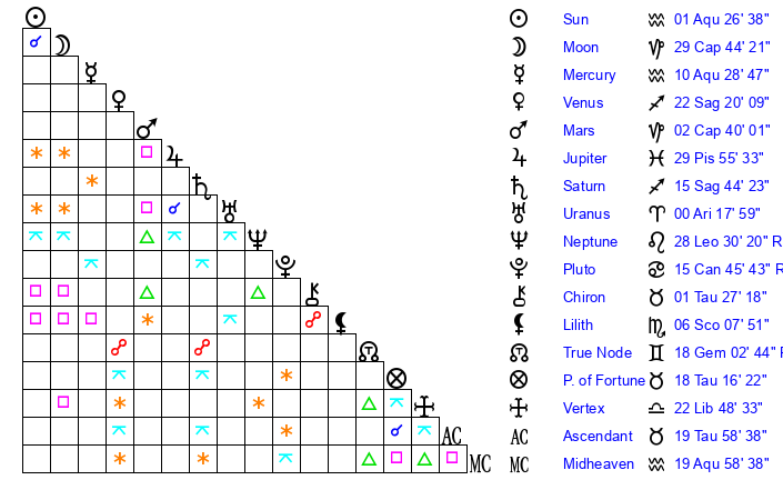 | Sun | 1 Aquarius 27 | 2 Aquarius 56 | 8 Taurus 8 |
