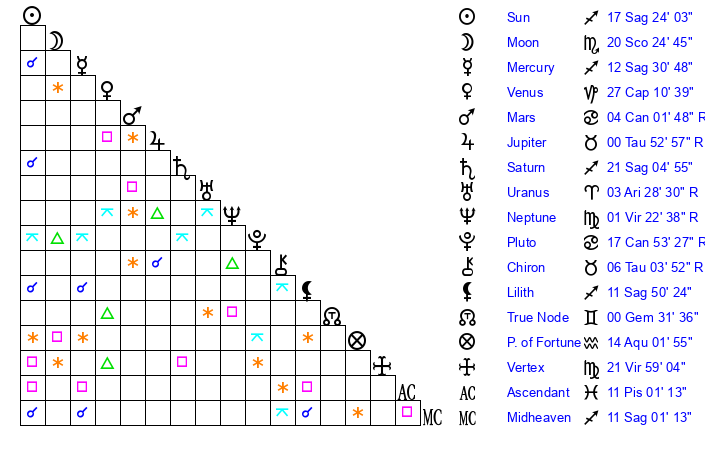 | Sun | 17 Sagittarius 24 | 17 Sagittarius 52 | 25 Pisces 38 |