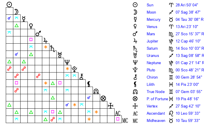 | Sun | 28 Aries 50 | 28 Aries 54 | 8 Gemini 29 |