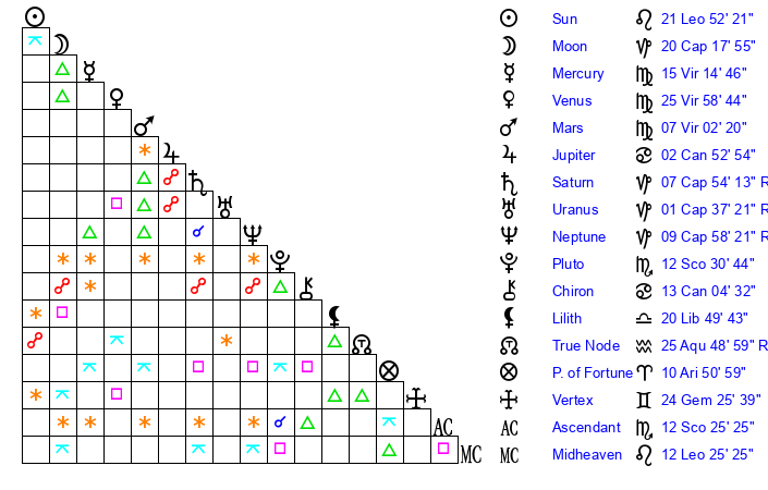 | Sun | 21 Leo 52 | 22 Leo 9 | 26 Virgo 43 |