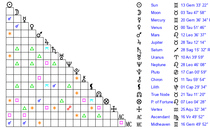 | Sun | 13 Gemini 34 | 14 Gemini 19 | 15 Virgo 32 |