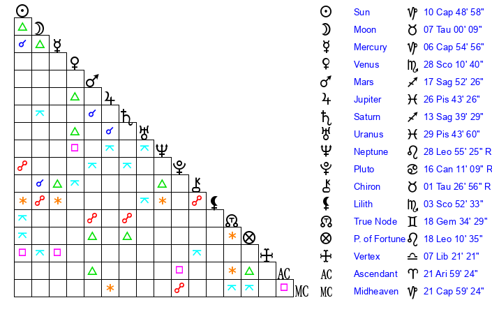 | Moon | 7 Taurus 10 | 28 Gemini 46 | 6 Sagittarius 7 |