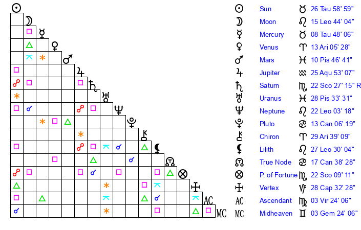 | Sun | 26 Taurus 59 | 28 Taurus 0 | 1 Virgo 43 |