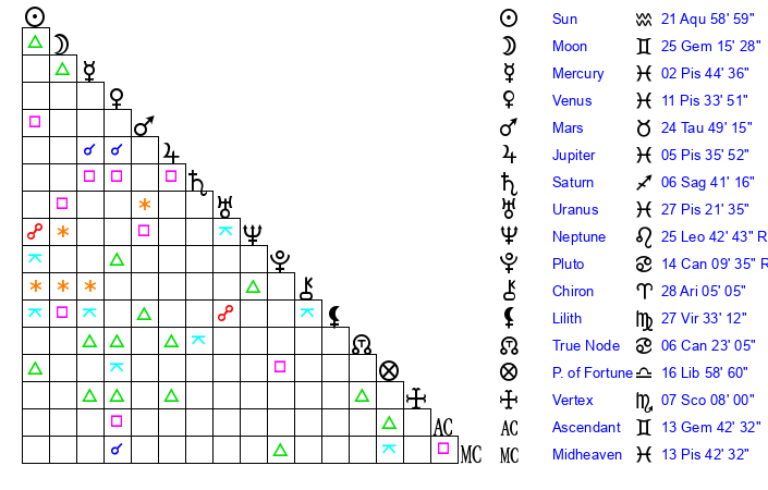 | Sun | 21 Aquarius 59 | 23 Aquarius 13 | 28 Taurus 40 |