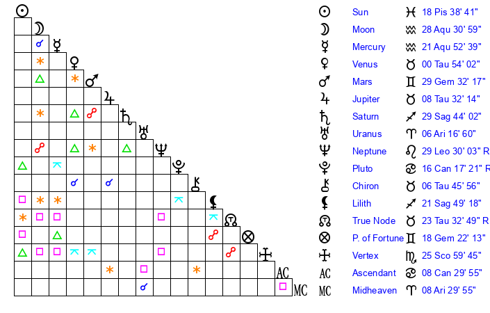 | Sun | 18 Pisces 39 | 19 Pisces 22 | 22 Gemini 10 |