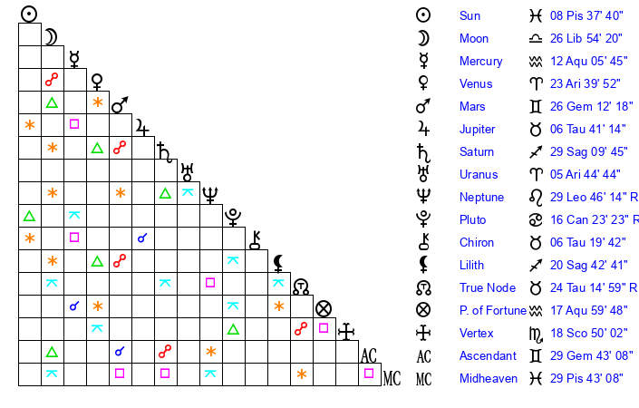 | Moon | 26 Libra 52 | 4 Pisces 55 | 19 Aries 38 |