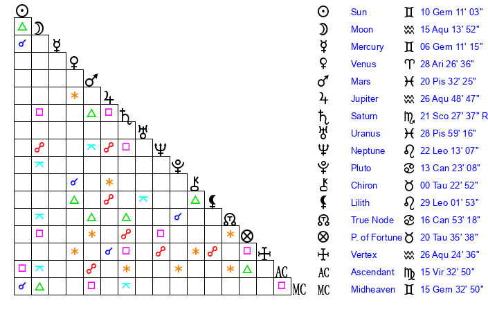 | Jupiter | 26 Aquarius 43 | 28 Gemini 6 | 19 Aquarius 12 |