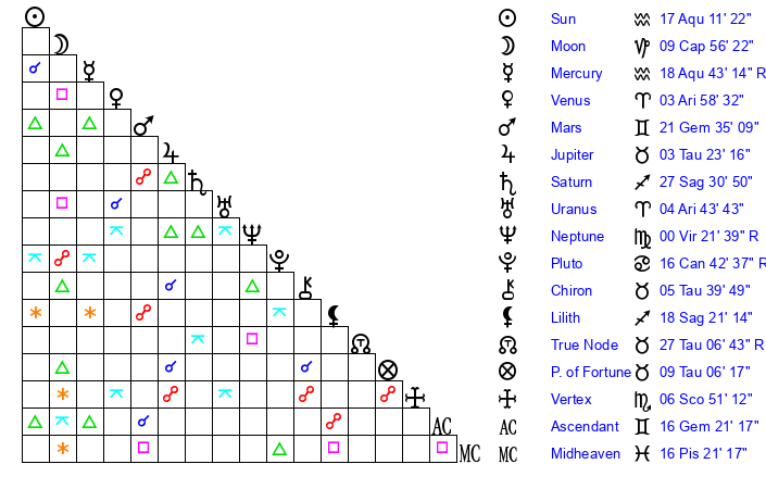 | Sun | 17 Aquarius 12 | 17 Aquarius 54 | 22 Taurus 11 |