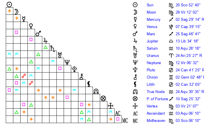 | Moon | 28 Virgo 11 | 9 Virgo 1 | 19 Aquarius 58 |