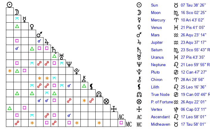 | Neptune | 22 Leo 0 | 1 Aries 1 | 24 Leo 3 |