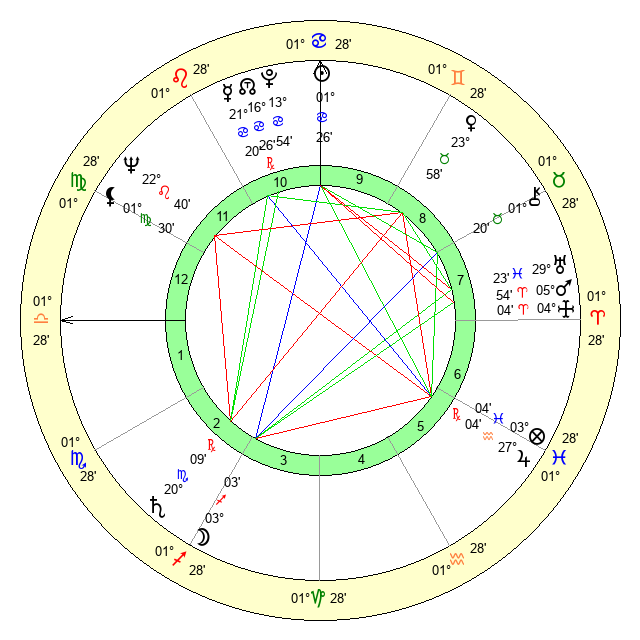| Sun | 1 Cancer 27 | 2 Cancer 29 | 6 Libra 46 |