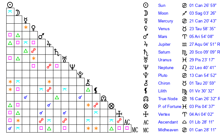 | Pluto | 13 Cancer 55 | 3 Aquarius 16 | 15 Cancer 54 |