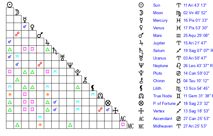 | Neptune | 26 Leo 44 | 0 Aries 5 | 27 Leo 21 |