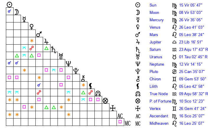 | Mercury | 26 Virgo 34 | 11 Virgo 23 | 3 Sagittarius 18 |
