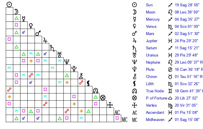 | Neptune | 29 Leo 10 | 29 Pisces 22 | 27 Leo 0 |