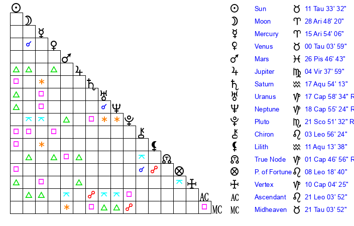 | Sun | 11 Taurus 33 | 11 Taurus 34 | 13 Gemini 21 |