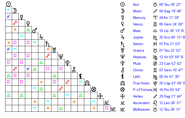 | Sun | 0 Taurus 39 | 1 Taurus 50 | 27 Cancer 2 |