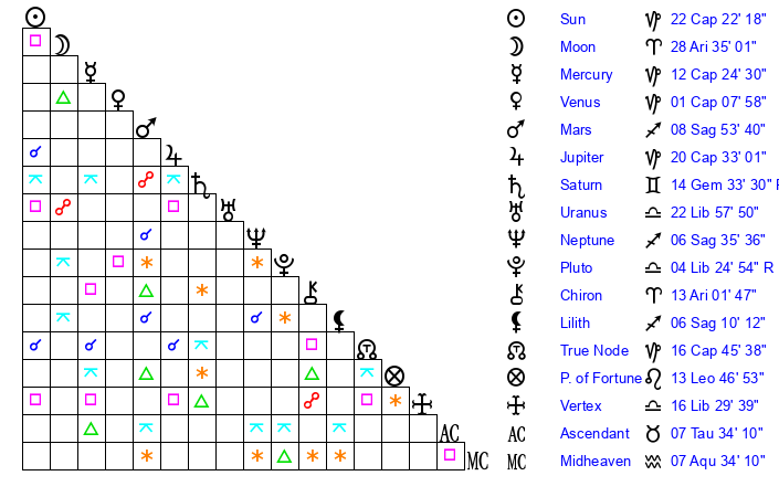 | Venus | 1 Capricorn 8 | 9 Pisces 53 | 6 Pisces 9 |