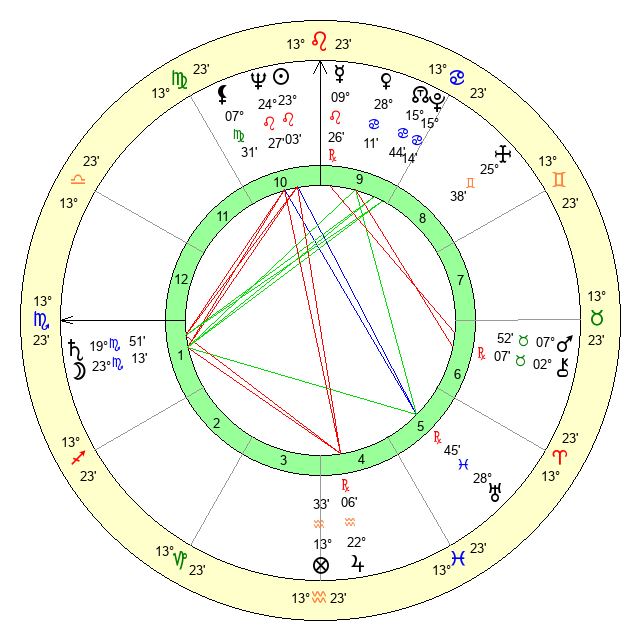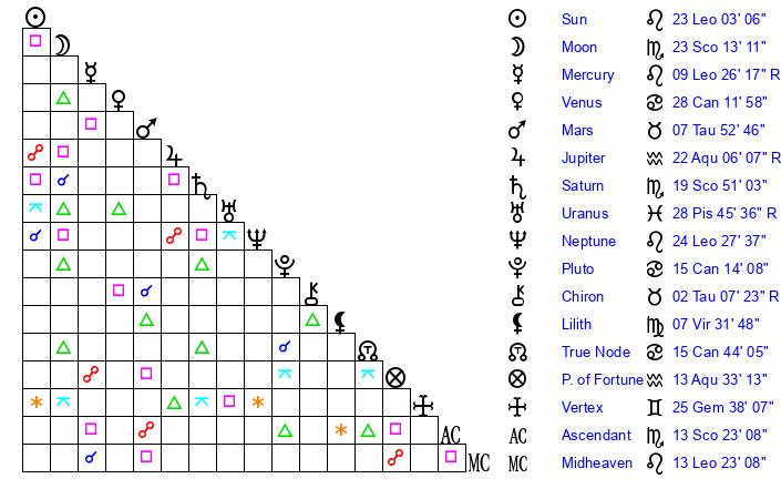 | Mercury | 9 Leo 26 | 5 Leo 57 | 6 Sagittarius 0 |