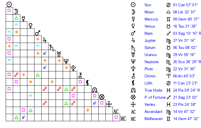 | Mercury | 9 Gemini 41 | 25 Cancer 37 | 18 Virgo 23 |