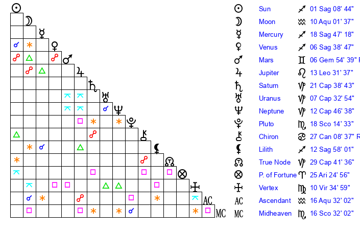 | Mercury | 18 Sagittarius 47 | 24 Scorpio 6 | 26 Sagittarius 43 |