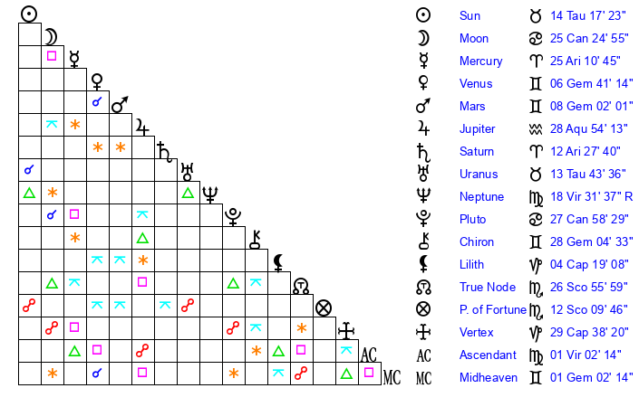 | Sun | 14 Taurus 17 | 15 Taurus 12 | 7 Leo 34 |