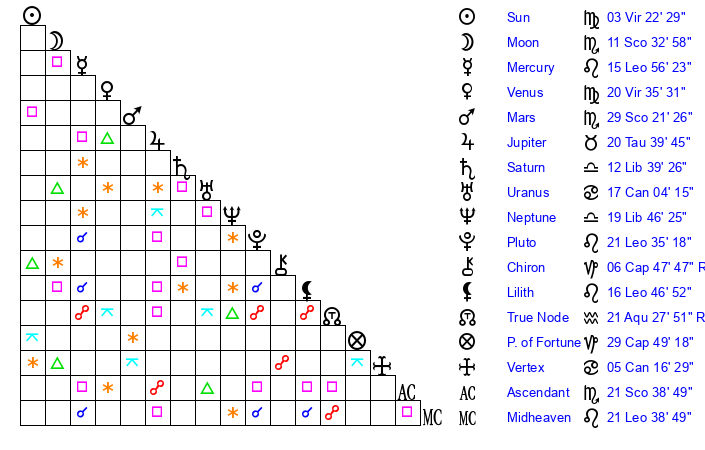 | Venus | 20 Virgo 36 | 1 Leo 13 | 20 Sagittarius 8 |