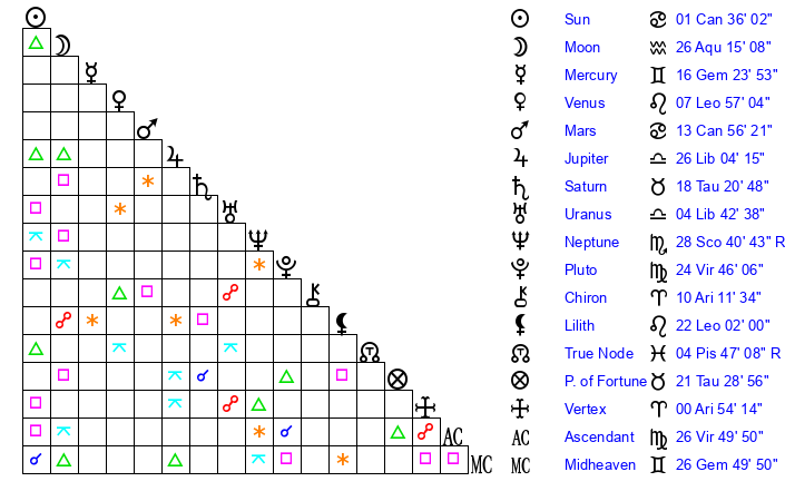 | Moon | 26 Aquarius 10 | 5 Gemini 35 | 29 Aquarius 15 |