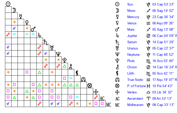 | Saturn | 14 Capricorn 56 | 25 Pisces 44 | 19 Capricorn 8 |