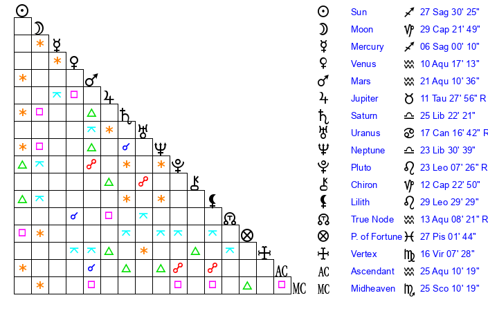 | Sun | 27 Sagittarius 30 | 28 Sagittarius 2 | 10 Pisces 34 |