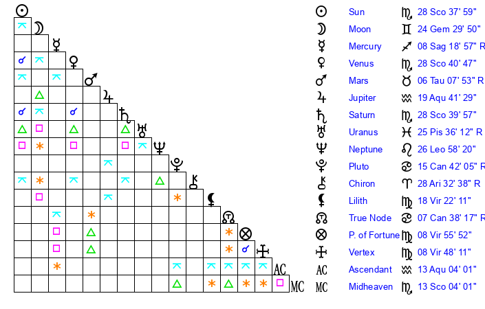 | Sun | 28 Scorpio 38 | 29 Scorpio 38 | 9 Pisces 7 |