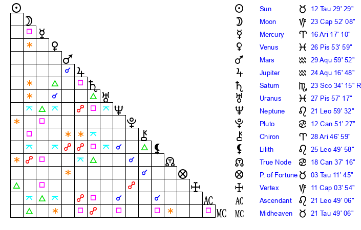 | Sun | 12 Taurus 30 | 13 Taurus 30 | 17 Leo 17 |