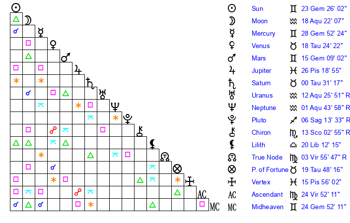 | Neptune | 1 Aquarius 43 | 2 Aries 3 | 1 Aquarius 5 |