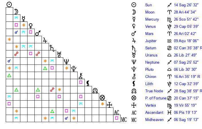 | Sun | 14 Sagittarius 26 | 14 Sagittarius 49 | 7 Aquarius 23 |