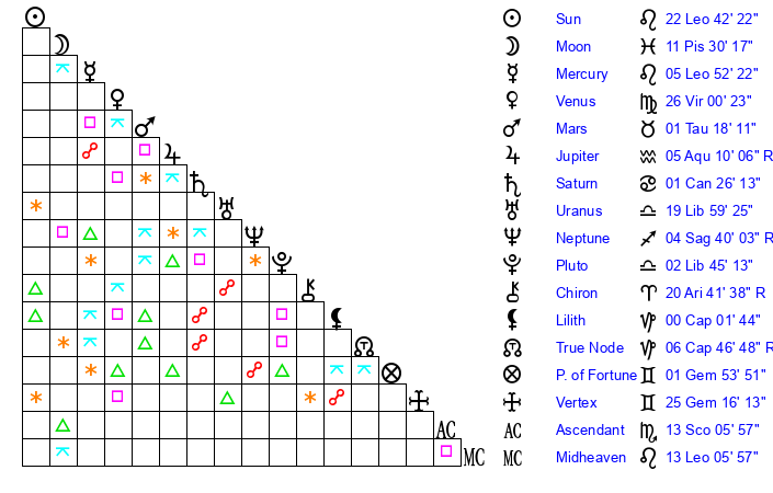 | Moon | 11 Pisces 36 | 16 Taurus 15 | 8 Aquarius 8 |