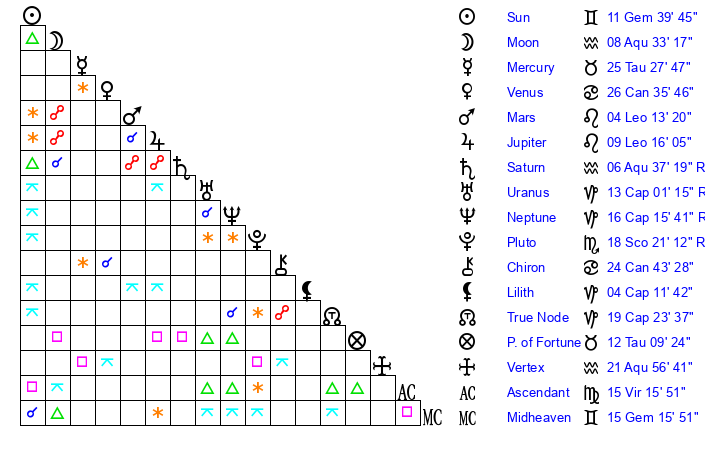 | Moon | 8 Aquarius 25 | 7 Virgo 26 | 3 Taurus 55 |