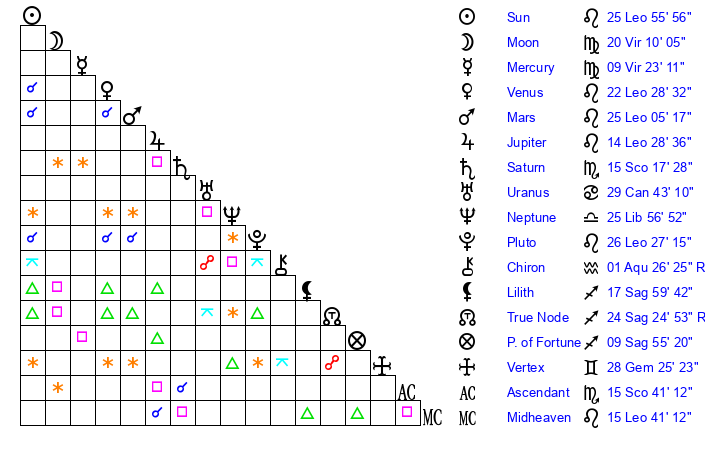 | Pluto | 26 Leo 27 | 2 Aquarius 0 | 28 Leo 20 |